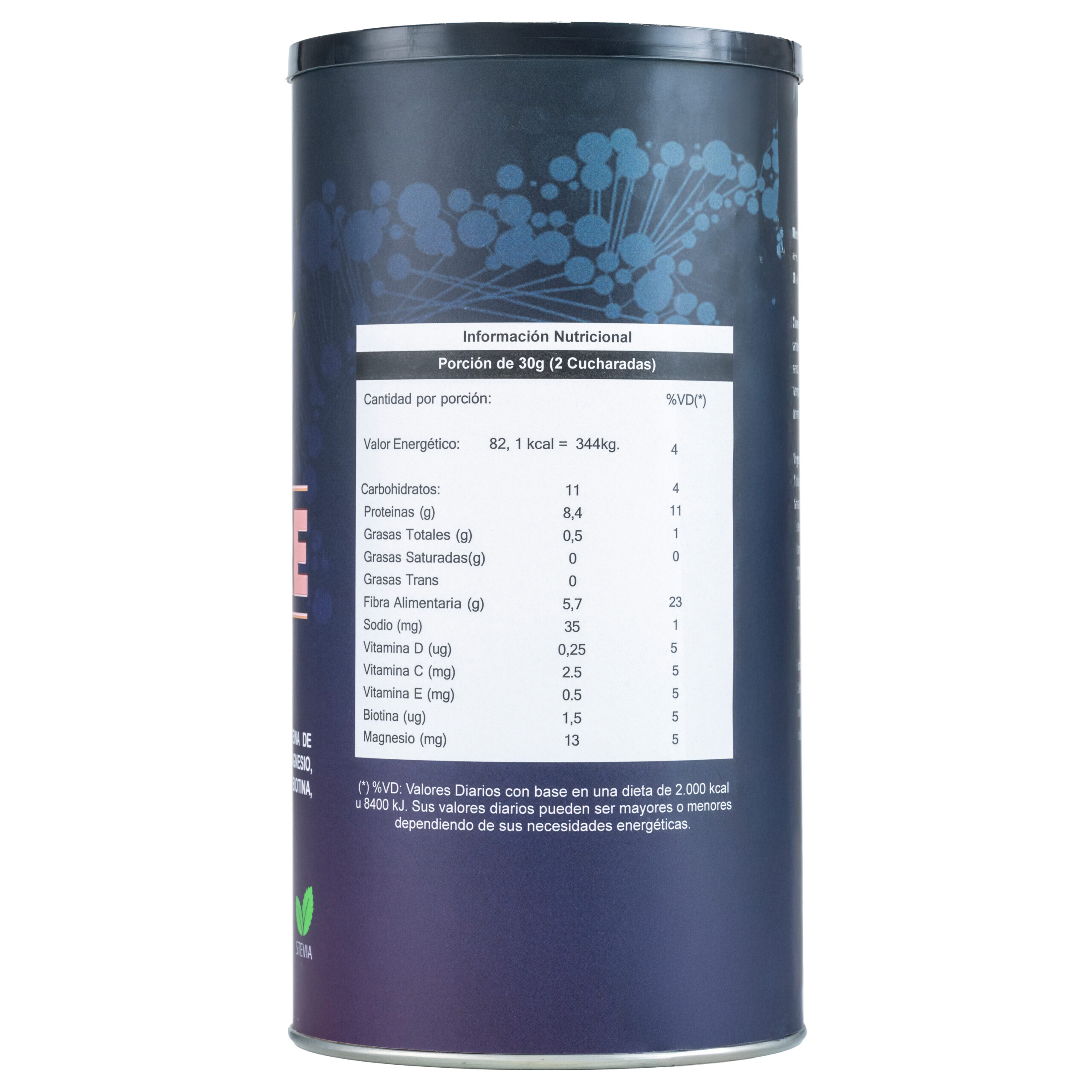 Alimento en polvo a base de proteína de soya con magnesio, colágeno hidrolizado, vitamina c, vitamina c, vitamina d y biotina.